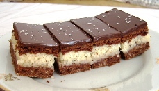 Krém: Z mlieka a múky uvarte hustú kašu a nechajte ho vychladnúť. Potom do nej zapracujte maslo s cukrom vymiešané do penista a urobte hladký krém. Z upečeného plátu stiahnite papier, okraje zarovnajte a cesto rozkrojte na tri pásy. Natrite ich krémom, uložte na seba a celé posypte kokosom.